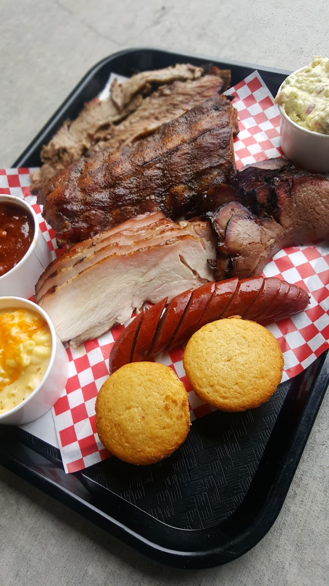 The food was fantastic! I had the turkey, brisket, and tri-tip. All were really good but I'd say the tri-tip was the best of the three. It was really tender and flavorful. For sides I had the corn bread and corn on the cob and both of those were also delicious. The cob corn was really juicy. The corn bread had corn kernels in it and tasted like it was baked with some honey in it. For drinks they have a Coke freestyle machine. I know not everyone is a fan but I really like them. The only partial downside was that seating was mostly large picnic tables which aren't very comfortable, but it worked OK for our large group.